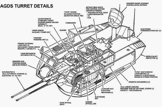 美国先后设计了多种基于XM1主战坦克底盘的防空坦克构型,分别采用40毫米机关炮和35毫米机关炮,这些设计方案被称为M1 AGDS自行高炮系统(Air-Ground Defense System),后来经过对比最终选择了35毫米机关炮。