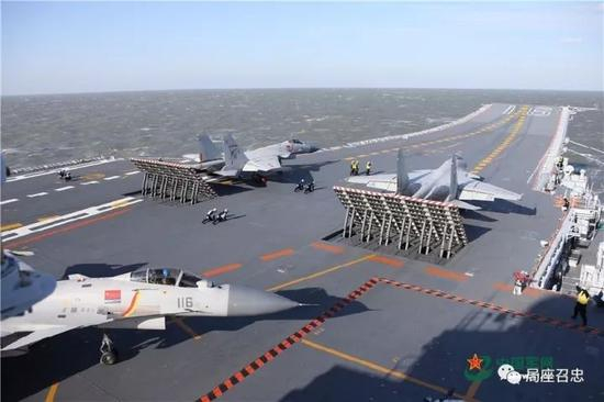 “10月上旬,辽阔的海面上,辽宁舰飞行甲板上一片紧张、忙碌,伴随着震耳欲聋的轰鸣声,一架架舰载战斗机腾空而起,直刺海天。”《解放军报》还援引一位歼-15舰载机飞行员的话报道称,辽宁舰此次出海,将“深化前期的训练成果,探索新的训练模式。”