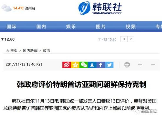 虽然11号的时候,朝鲜外交部对这次特朗普的亚洲行发表了评论,说“特朗普这次访问期间,显露了他摧毁世界和平与稳定的本质,乞求朝鲜半岛上的核战争”,还说特朗普是“老疯子”,但是,今天韩国统一部发言人白泰铉评价说,朝鲜对特朗普访问韩国等亚洲国家的反应从形式和内容上都较以前保持克制。