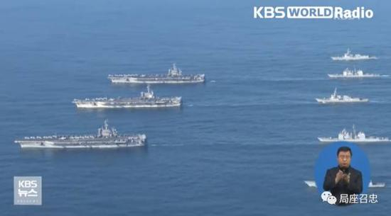 根据韩国军方的消息,三艘航母中的一艘是在11月11号那天进入朝鲜半岛东部海域韩美联合战区(KTO)的,另两艘12号下午才到。