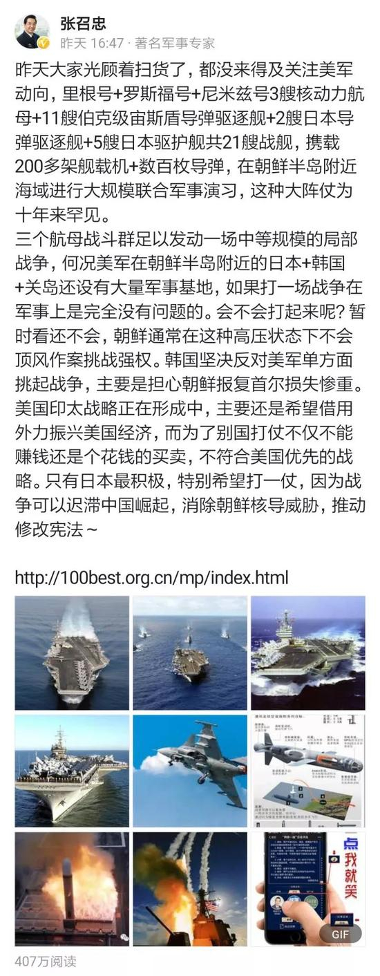最后,只有日本最积极,特别希望打一仗,因为战争不仅可以迟滞中国崛起,消除朝鲜核导威胁,更重要的是推动修改宪法,咱们以前说过,那可是安倍晋三的夙愿。(作者署名:局座召忠)