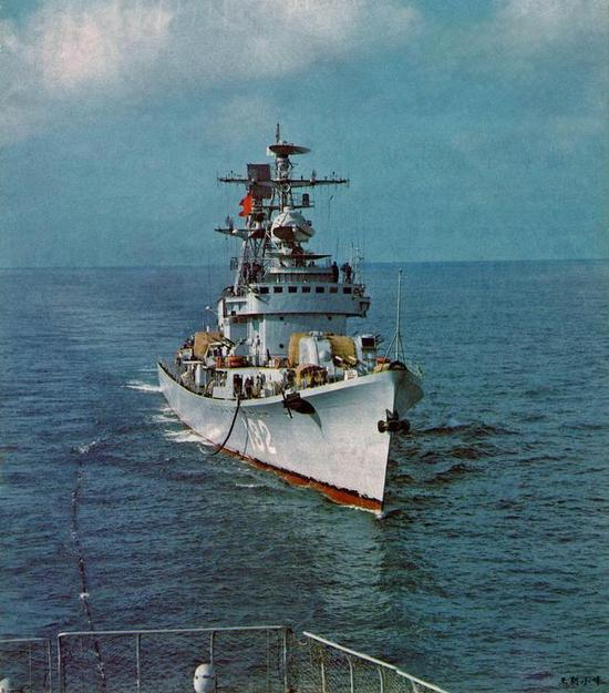 图片:出访的132号导弹驱逐舰,注意后部桅杆上平板状的381甲三坐标雷达。