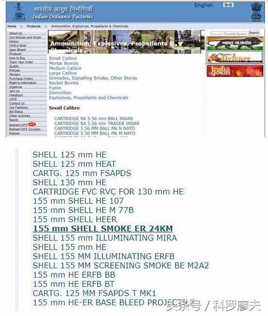 登陆印度兵工署的网站,我们会看林林总总的大量自产弹药,其中就包括各种大口径炮弹。