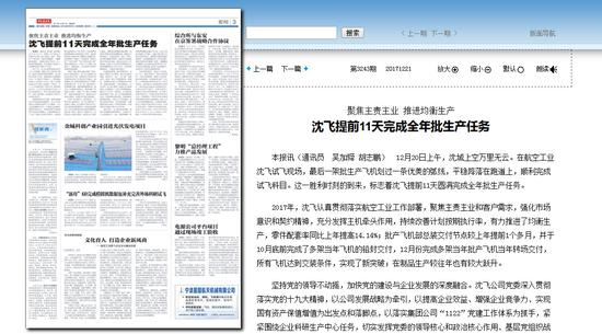近日,《中国航空报》发布了题为《沈飞提前11天完成全年批生产任务》的文章。报道提到,12月20日,航空工业沈飞的最后一架批生产飞机顺利完成试飞科目,标志着沈飞提前11天圆满完成全年批生产任务。