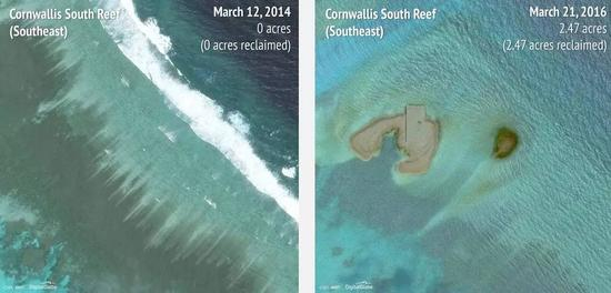 越南在南华礁(西南)非法填海造岛前后对比图。