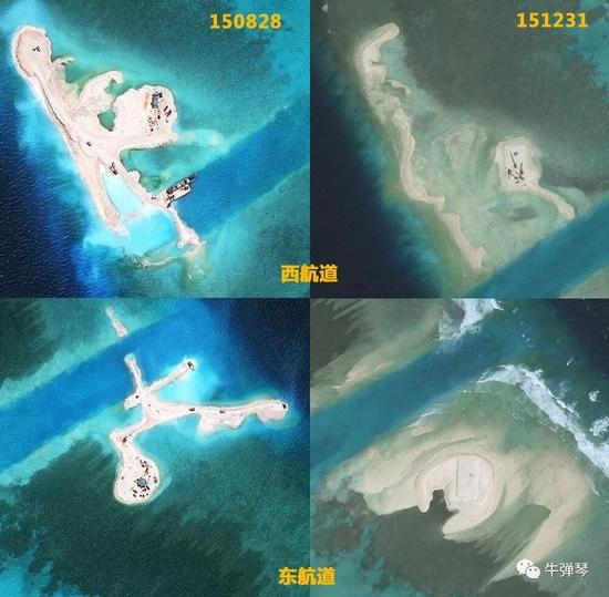 比如卫星图片显示,原先越南在南华礁东南和西南各围出了一个小岛,但万万没想到,2015年的台风“茉莉”突然袭来,很多个月的努力一扫而空,所填岛礁竟然被吹走了。