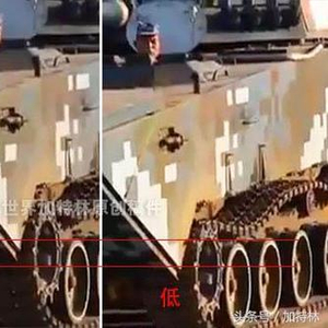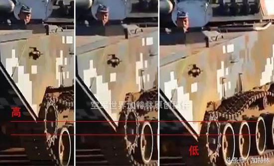 注意看上图中的这一战车,左侧显示最前方的主动轮位于较高的位置,右侧显示主动轮已经降低到了几乎与后方负重轮一样低的位置。