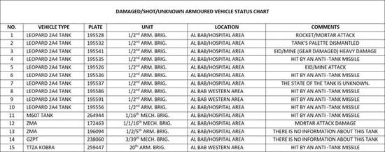 ■外媒统计的土耳其陆军“幼发拉底河之盾”行动战斗车辆损失,每一辆都注明了车号、所属部队、被击毁位置、被击毁细节等信息,60%以上被击毁的坦克(车)都有照片及卫星照片佐证。