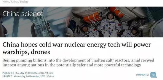报道中称,“参与了中国这一项目的上海应用物理研究所的研究人员严龙(音)说,这一设施可能最终会让中国研发出核动力船舶或飞机。”