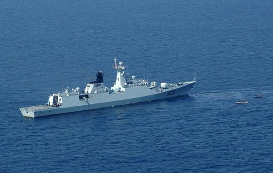 054型护卫舰首舰马鞍山舰在亚丁湾执行护航任务。