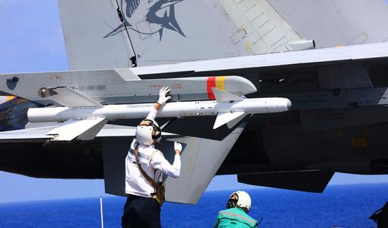 歼-15挂载PL-8空空导弹实弹,在东海进行演练。