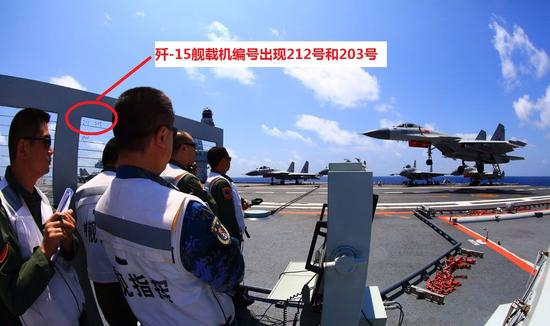 就在近一周前,央视画面曝光207号、208号歼-15舰载机,第二个航母舰载战机团首次曝光。公开资料显示,中国海军第一个航母舰载战机团战机编号为1XX,目前已曝光的编号从100号到126号,共有27架。由此推测,2XX号歼-15隶属于第二个航母舰载战机团,目前已曝光203号、207号、208号、212号4架。但是从编号顺序来看,从200号到212号,第二个团至少已有13架歼-15舰载机。
