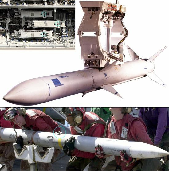 AIM-120的前挂点突出一个类似AIM-7的按钮结构(下图蓝圈处),F-22的挂架设计了一个圆孔(上图蓝圈处)让它能够伸入