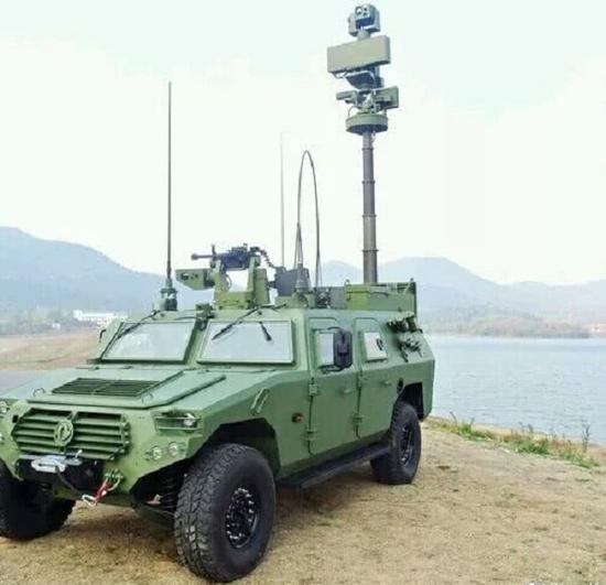 合成旅侦察营装备的猛士高机动侦察车,可以看到桅杆处于升起状态,各种侦察设备已经展开