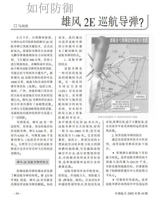 ▲早在2005年的相关官方纸媒中,就有了阐述关于如何防御雄风2E巡航导弹方法的文章
