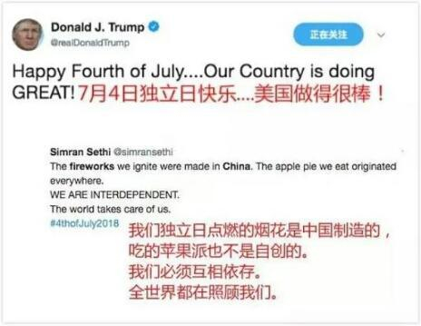 他们纷纷在网上发帖:“我们独立日点燃的烟花是中国制造的,吃的苹果派也不是自创的。我们必须互相依存。全世界都在照顾我们。”