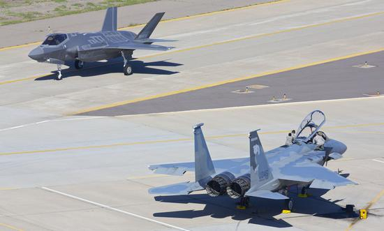 日本F-35A战机在卢克空军基地与美军F-15战斗机进行联合演习。