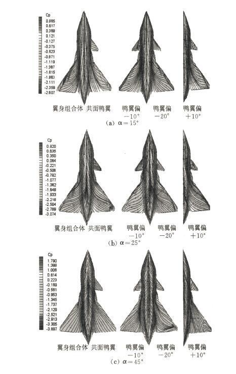 鸭翼布局的最大增升效果主要体现于大迎角阶段鸭翼涡对主翼涡的干扰作用,在大迎角阶段,鸭翼涡与主翼涡相互诱导,鸭翼涡桨边条涡推向外机翼,是机翼前缘形成单一集中涡,从而改善机翼流场达到增升效果,而鸭翼涡则被诱导到机翼内侧上方,鸭式布局主翼涡比常规边条涡延迟破裂,原因是鸭式布局主翼涡有机翼前缘涡流卷入,涡流强度得到增强所致。