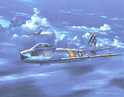 主人公是后来的美国空军准将James Robinson Risner,1952年来到韩国在美军第4战斗机联队第365战斗机中队任小队长,座机是著名的F-86E-10型,机身编号51-2824,战争期间总共击毁过8架米格15,是一名王牌飞行员。