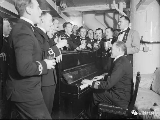 ▲ 英国皇家海军“罗德尼”号战列舰上的钢琴,你看军官们拿着饮料多开心