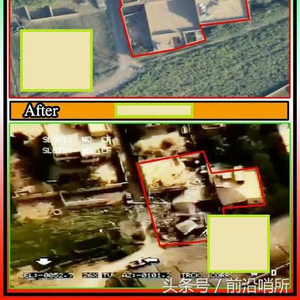 从上图可以看到,导弹稍微打偏了一点,弹着点在黄色圆圈一带,没有命中靶心。在袭击前的对比图上,有一辆卡车(长度7~10米),由此可以推算出弹着点距离靶心大约偏差了10~15米。