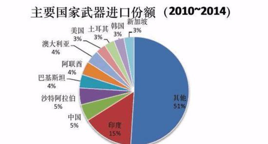 我国在武器科研上相较于美国和俄罗斯还是有段距离的,因此在国际军火市场上中国并不是所谓的武器巨头,在2010到2014年区间我国的武器出口和进口占军火市场份额连百分之五都没有,而美国和俄罗斯几乎站占据了一半以上。