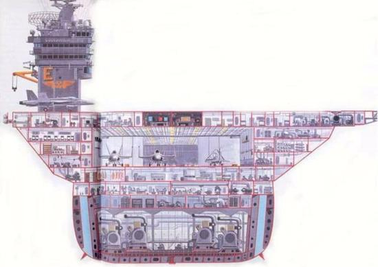 这种设计其实就是将航空母舰的船体底部分隔成无数个隔舱,即使其中的某一个隔舱或者多个隔舱受到打击破损,也不会影响船舱的整体布局,这种设计将航空母舰甲板的破损度降到最小,从而保证航母的正常运转,确保各系统正常工作。如果一颗鱼雷打过来击中航母,航母也是不会沉的。即使它被导弹打的千疮百孔,也不会沉没。
