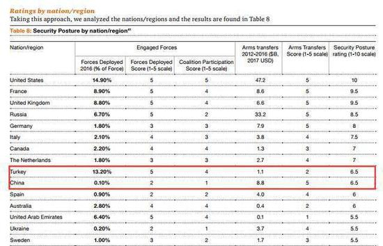 给土耳其军事影响力排全球第九的是英国普华有道公司发布的《2017全球防务透视》报告。需要明确的一点是,这份报告中提到的军事影响力,不同于全球火力网发布的《全球火力指数》,前者相比后者,不仅考察一国的装备水平,还非常注重该国在国际防务中的参与度、活跃度以及在武器贸易领域的成就。有意思的是,在《2017全球防务透视》军事影响力排行榜和《全球火力指数2018》排行榜中,土耳其都排在第九位。