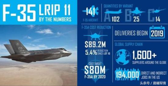 然而,事情正在发生变化,在服役7年后,F35再次迎来自己的大降价时刻。9月28号,美国五角大楼称,已经与洛马公司签署了第11批F35战机的合同;该合同共计战机141架,总金额115亿美元(应该是不含发动机的)。而含发动机、航电系统后,也就是飞离价格方面,相对于第10批合同,F-35A的单价下降到8900万美元,F-35B下降到1.16亿美元,F-35C下降到1.08亿美元;其中,F35C的下降幅度高达11.1%。这是F-35A的单价第一次下降到9000万美元以下,根据五角大楼的目标,到2020年,F-35A的单价将下降到8000万美元左右。而下一次,美国五角大楼将一起签署第12-14共三个批次的合同,预计数量达440架。