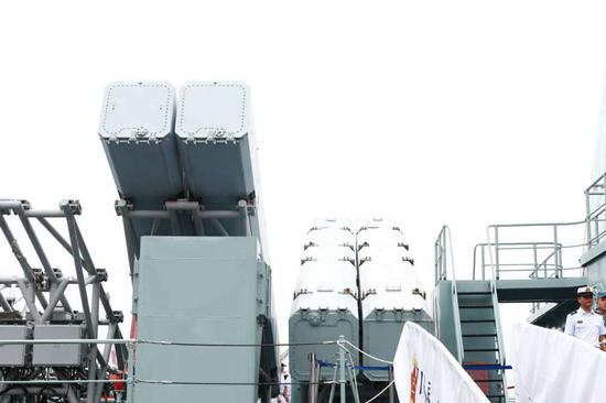 深圳舰的改装重点主要分为防空、反潜和雷达这三个方面。防空方面是拆除了原本的HHQ-7近程防空系统和机库上的四座双37防空炮,取而代之的是舰首甲板上的32单元通用垂发装置和两座1130近防炮。这两款防空系统已经在054A护卫舰上大规模装备,算是成熟装备,其中垂发系统可以兼容HQ-16系列防空导弹和鱼-8火箭助推鱼雷,防空拦截范围相比之前的HHQ-7扩大了十倍以上。1130近防炮虽然只有两座,但射速近乎相当于之前四座双37的10倍,大大提高了本舰的生存能力。