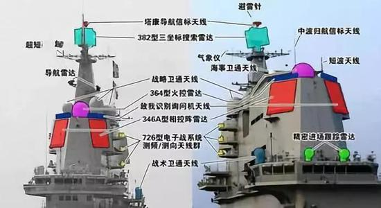 而在新航母上,则充分考虑到隐身效果,346A型舰载雷达的相控阵雷达天线阵面不再正对着航向正前方方向,而是两个阵面分别向左右偏出几十度角。