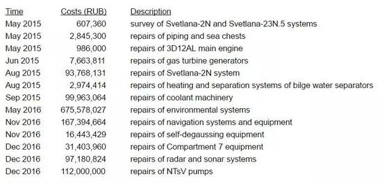 2015年开始“库兹涅佐夫”号维修费用(单位:卢布)