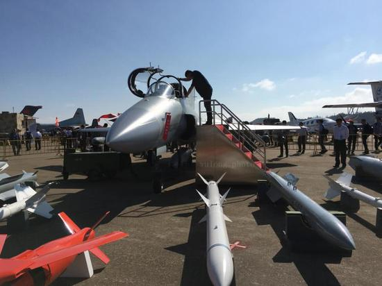 静态展示区中的一架“神鹰”,机头显然是带有防雷条的雷达罩,可以安装“枭龙”战斗机同款的KLJ-7型脉冲多普勒机载火控雷达,客户有需要,加装KLJ-7A或航空工业雷达院研发的LKF-601E有源相控阵雷达都没问题,因此“神鹰”可以发射SD10(霹雳12)这样的射后不理主动雷达中距空空导弹,还能携带CM102反辐射导弹和一大票精确制导炸弹。