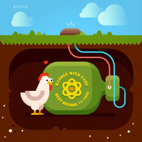 当核地雷被垂直埋设到西德的地下后,在其竖直的引信旁边安装一个鸡笼,在里面简单地养上一只鸡,就能依靠鸡只40摄氏度的体温来维持引信电子系统脆弱的触发机构正常运转。同时在鸡笼内还会预备上一些“鸡粮”以维持鸡只的生命并防止它啄食内部电线。总之,被固定在地雷内部的鸡会存活上大约8天,随后炸弹会因鸡的升天恢复到冷却和不可操作的状态,因此在核地雷里面养鸡也是较靠谱的保险措施,不过很不人道而已。