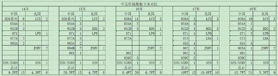 2017年,中国下水各型舰艇15艘,总吨位19万吨;美海军下水各型舰艇10艘,总吨位10.6万吨;