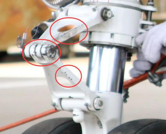 前起落架零件表面的白色保护漆脱落,这就是降落冲击带来的后果