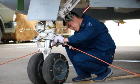 这是一架空军的歼10B战斗机,地勤人员正在进行进行维护前起落架
