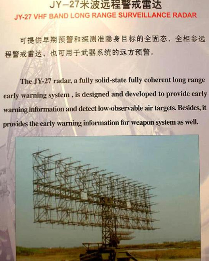 JY-27反隐身远程雷达,是一种探测距离远达330公里、定位精度150米,可发现隐身飞机或导弹的先进雷达。隐身飞机能够有效的减少波长较短的雷达的探测距离,例如优化尺寸较小的机体边缘或表面的形状,弱化散射回波信号。但是,由于米波的固有特点,它能够令敌机整体机体外廓产生足够强度的回波,而隐身飞机无法令自己整体尺寸变得很小,这使得米波雷达在发现隐身飞机方面有突出优势。