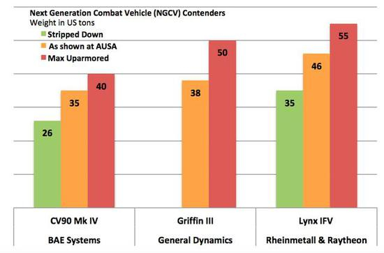 西方几款装甲战斗车的重量对比,重量随防护直线上升