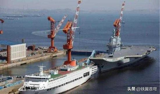 航母在进行出航之前,需要补给大量的油水和干货。如果仅仅依靠码头上的补给设备和车辆,可能需要很长的时间,甚至要几天几夜,耽误试航的进度。干脆,派一艘大型综合补给船靠近码头,同时进行多路补给,不仅效率提高了好几倍,还顺带演练了海上横向补给的基本套路。由于国产航母的补给装置都在右侧船舷,而码头右边是造航母的大船坞,于是就灌满水让补给舰开进去,隔着码头为航母输送物资。