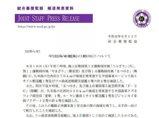 据日本防卫省消息,东京时间6月10日上午7时左右,中国海军051C型驱逐舰石家庄舰,901型综合补给舰呼伦湖舰通过宫古海峡向东南方向航行,日本海自出动山雾号、海雾号、松雪号三艘驱逐舰跟踪监视。