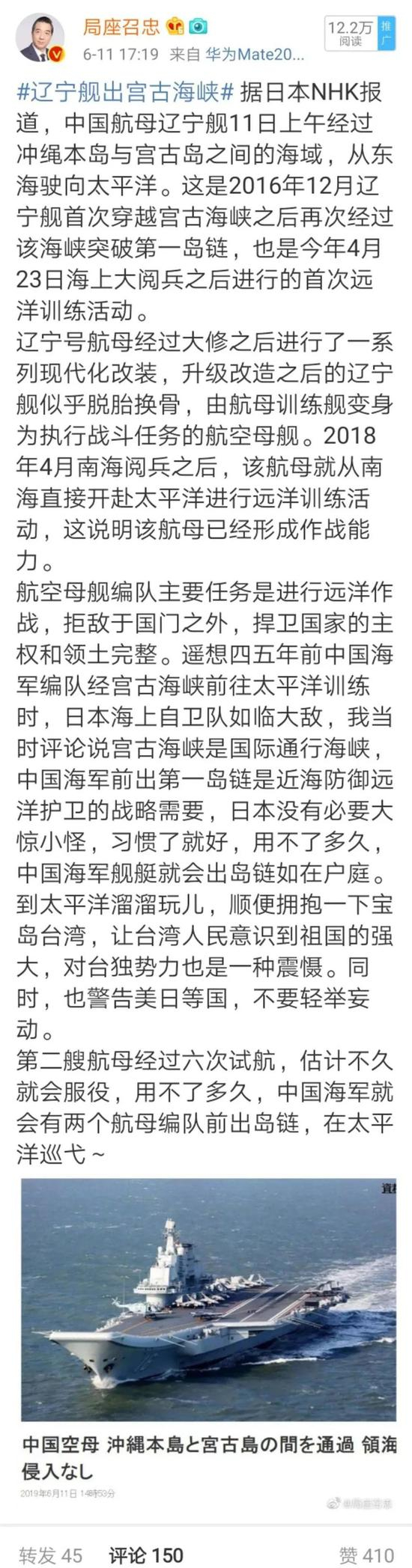 张召忠谈辽宁舰出岛链:让台湾人民意识到祖国的强大