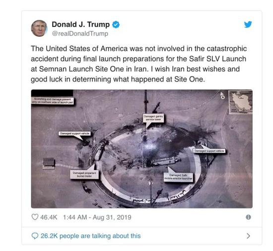 8月30日特朗普发推文称:“在伊朗火箭发射场为Safir空间运载火箭发射进行最后发射准备期间,发生了灾难性的事故。我在此表示,美利坚合众国与这起灾难性事故没有任何关联。我向伊朗致以最好的慰问,并祝伊朗好运,能够确定发射地点出现了什么事故!”附带推文,特朗普还展示了一张出事故的发射场照片。