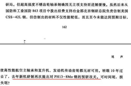 在中航撰写出版的《中国航空工业院士丛书——如钢人生》中,作者在“尾声”中提到这一一件事情:国内在2008年第二次提出对PH13-8Mo高强度不锈钢的预研攻关。PH13-8Mo是美国在1968年成功研制的一种沉淀硬化不锈钢,其特性是高强度、高韧性,而且具备良好的耐腐蚀能力。