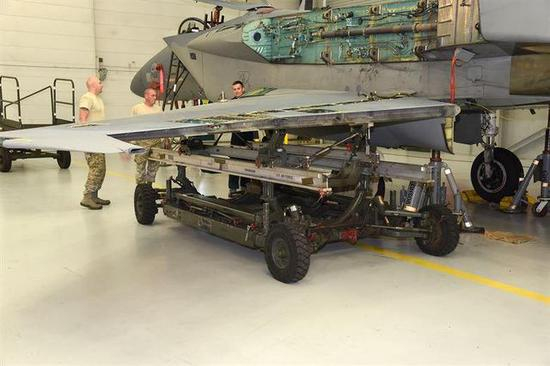 图:F15C更换机翼,注意机身与机翼的接头位置。战机的不同结构部分,需要通过大量的高强度螺栓螺母等紧固件进行结合