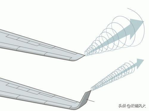 对于桨尖下反,典型的代表就是美国的黑鹰直升机采用了后掠加下反的桨叶,叶尖下反20度。下反的桨叶有什么作用呢?我们刚才在上边讲了,桨尖涡的产生是因为在翼梢处,没有什么遮挡,这样下翼面的高压气流就绕过翼梢向上翼面流动,于是产生了涡。桨尖下反就相当于在桨尖加了一块向下的板子,对向上绕流的气流产生遮挡作用。这样就能够减弱桨尖涡的强度。无独有偶,也不仅仅是黑鹰直升机这么干,经常坐飞机的朋友可能会发现,客机的翼梢处也有这么一块板子,我们叫它翼梢小翼。波音和空客的飞机这块板子的形状还有很大的区别。感兴趣的可以看一下我之前发的一篇有关翼梢小翼的文章。