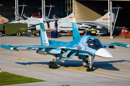 ▲为了营造“志愿空军”的效果,驻叙俄空天军部队一度曾把其机徽等标志涂掉,但不久之后就停止了这种此地无银三百两的做法。图中的苏-24当时已经恢复了机徽,苏-34还未改回去