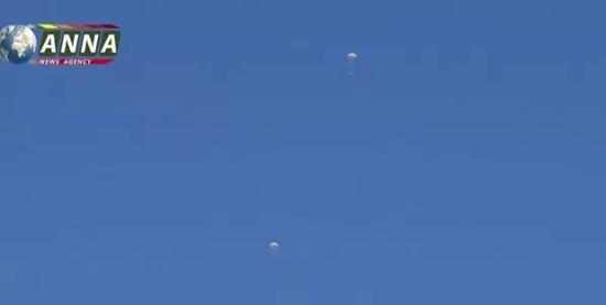 ▲图为跳伞的叙利亚空军飞行员,据俄罗斯ANNA电视台报道,飞行员均在叙军阵地附近着陆,安全获救