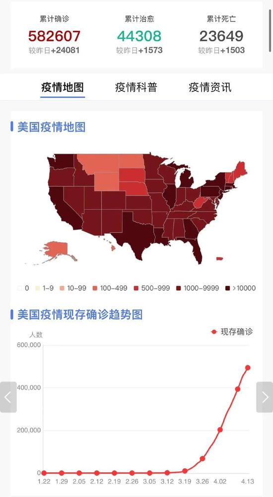 目前,美国的疫情仍在加速蔓延。截至今天下午3点,美国已经确诊582607名新冠肺炎患者,累计死亡23649例,累计治愈44308例,累计确诊、死亡和治愈分别较昨日增加了24081、1503和1573例,现存确诊病例仍在快速增长。
