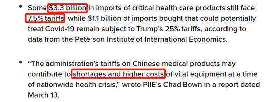 根据彼得森国际经济研究所的数据,总值约33亿美元的关键医疗产品进口到美国,关税为7.5%,11亿美元的抗疫物资的关税更是高达25%。此外,由于美国的贸易保护政策,更多的中国医疗物资可能会流向其他国家,毕竟现在医疗物资紧俏。
